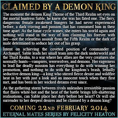 Find out how to enter the Claimed by a Demon King international giveaway (ends March 2nd) and be in with a shot of winning a $75, $50 or $25 gift certificate at her website, where you can also download a 6 chapter sample of the novel: http://www.felicityheaton.co.uk/cbadk