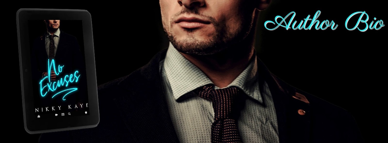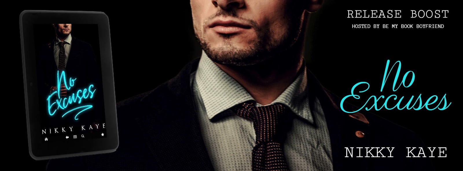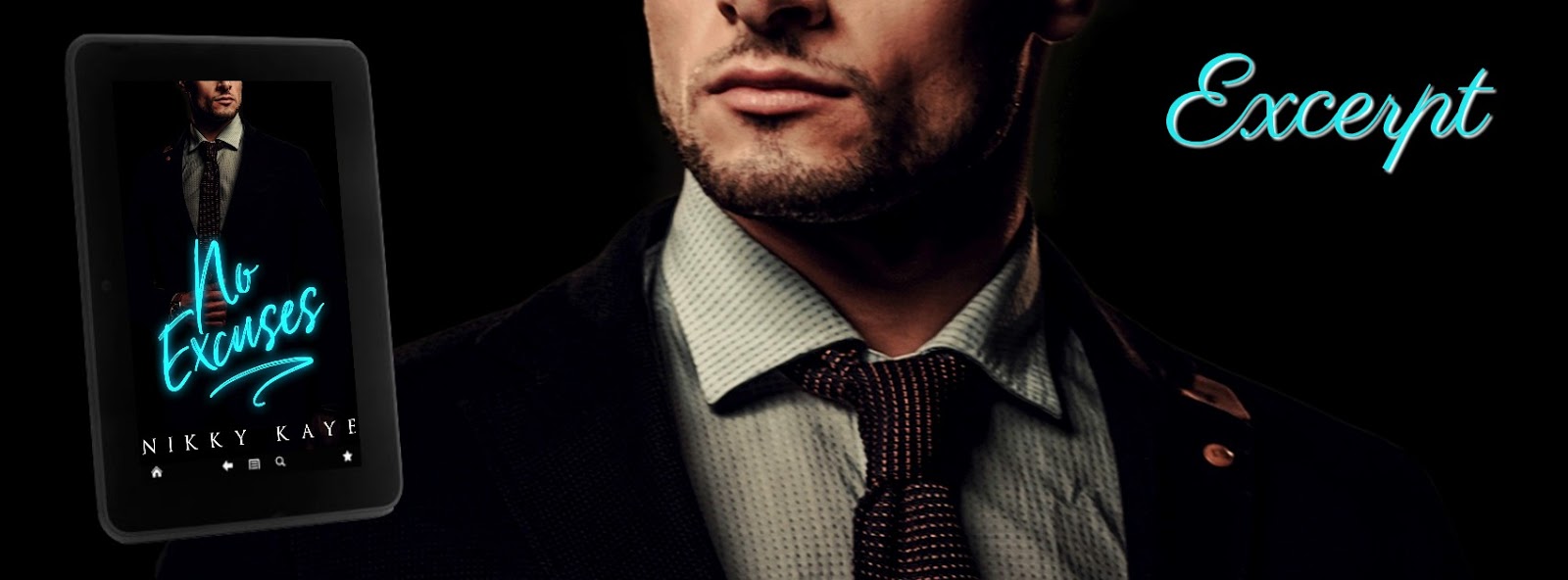 No Excuses is a hot, full-length contemporary romance, featuring blindfolds, rope play, food fights, and sexy architectural features like wainscoting. As in all Nikky Kaye books, cheating is not allowed, but a little angst, some funny business, and a HEA are non-negotiable.